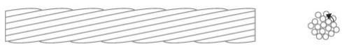 Rope Stranding -Wire constructions consist of single strands assembled together into concentric or bunched confiqurations. Rope stranding has the advantage of increasing flexibility by using a larger number of finer strands while maintaining a tighter diameter tolerance than a simple bunched con- struction. Ropes are more evident in the larger AWG sizes, such as 8 AWG and larger, but there are also many applications that require the flexibility of rope constructions in the smaller gauges. Constructions vary and can contain hundreds or thousands of strands.